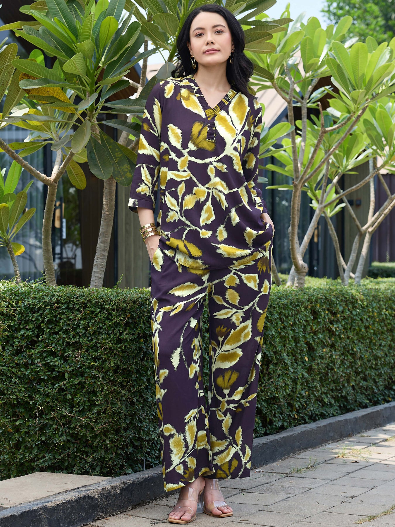 - Rayon Yellow Leaf Printed Viscos consists of shirt and pyjamas