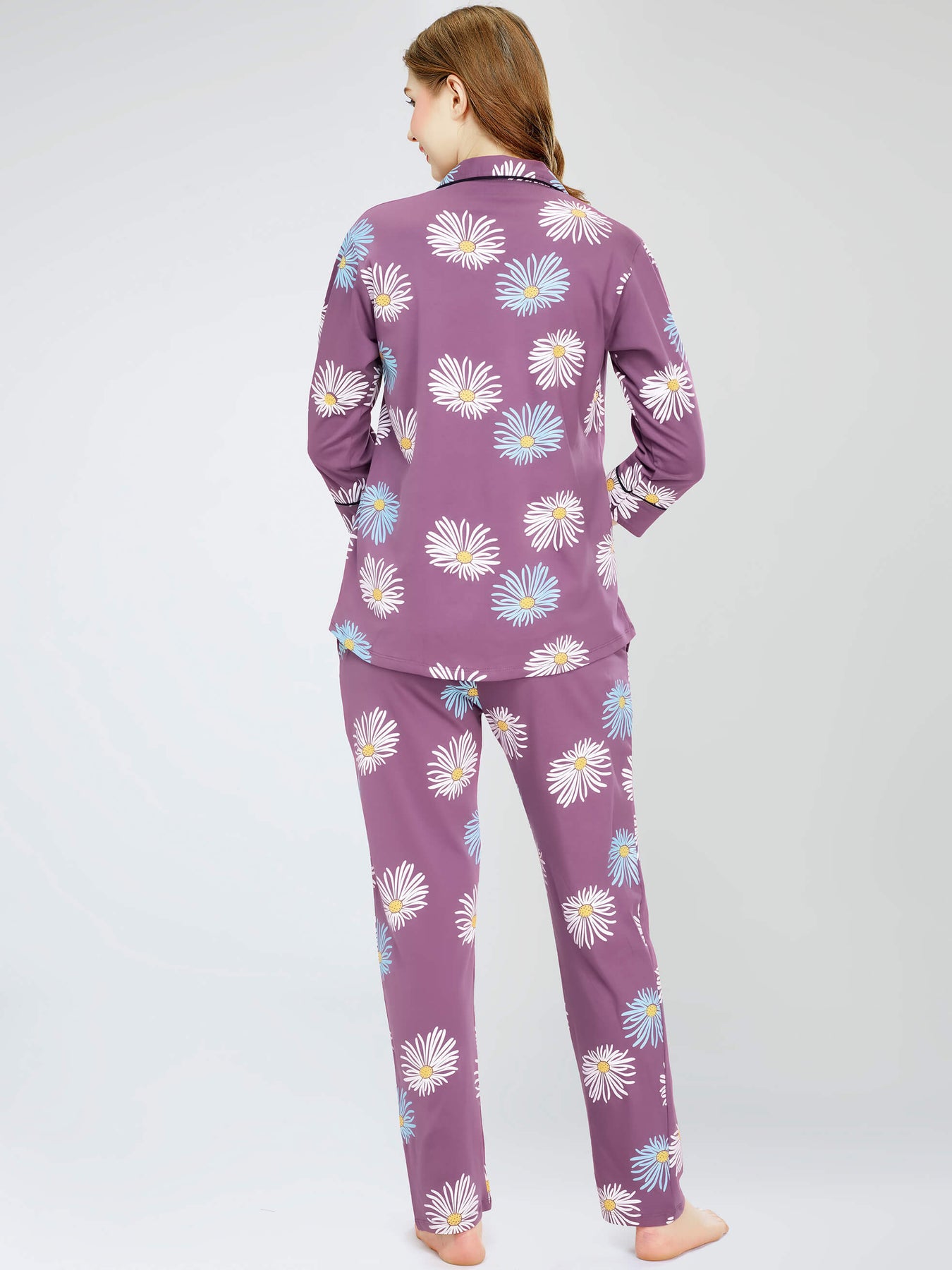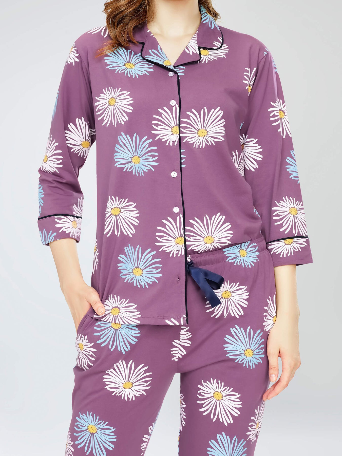 - Mauve Floral printed night suit consists of shirt and pyjamas