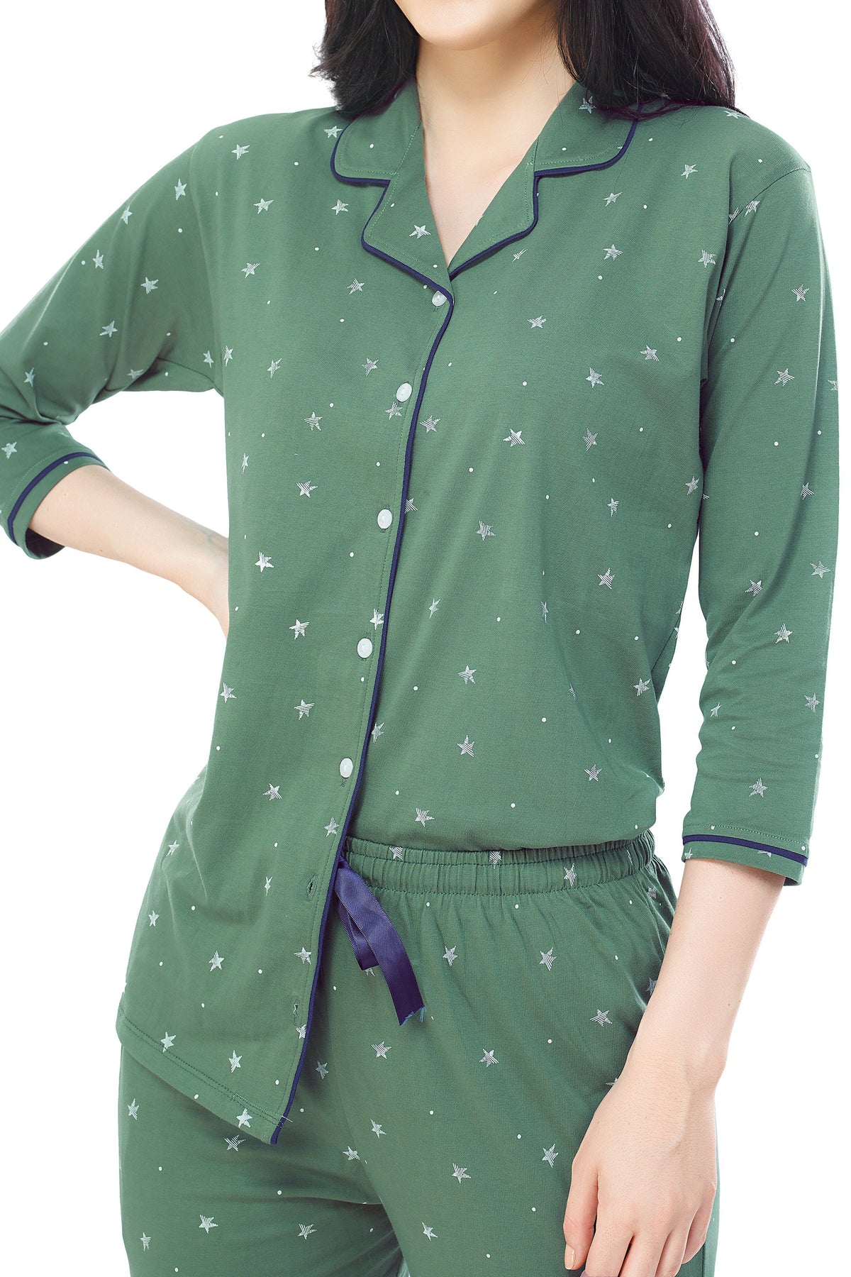 - Green star printed shirt, has a notched collar, three-quarter sleeves