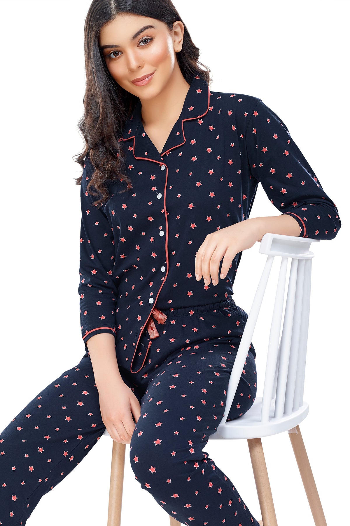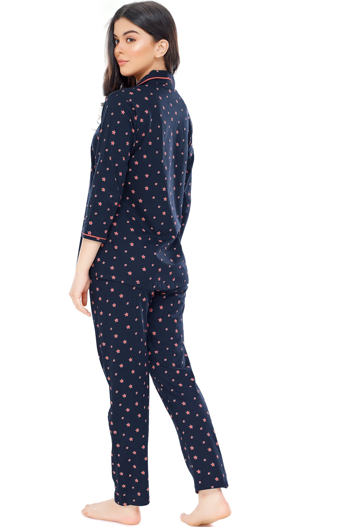 - Navy blue star printed night suit consists of shirt and pyjamas