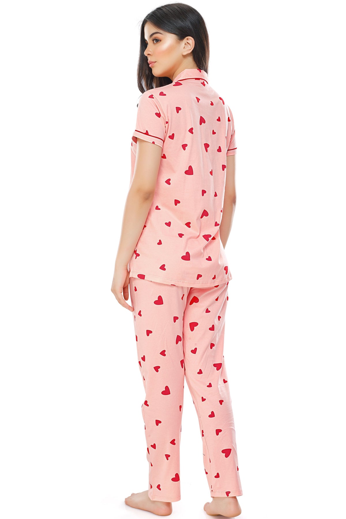 - Peach, red heart printed shirt, has a notched collar, short sleeves
