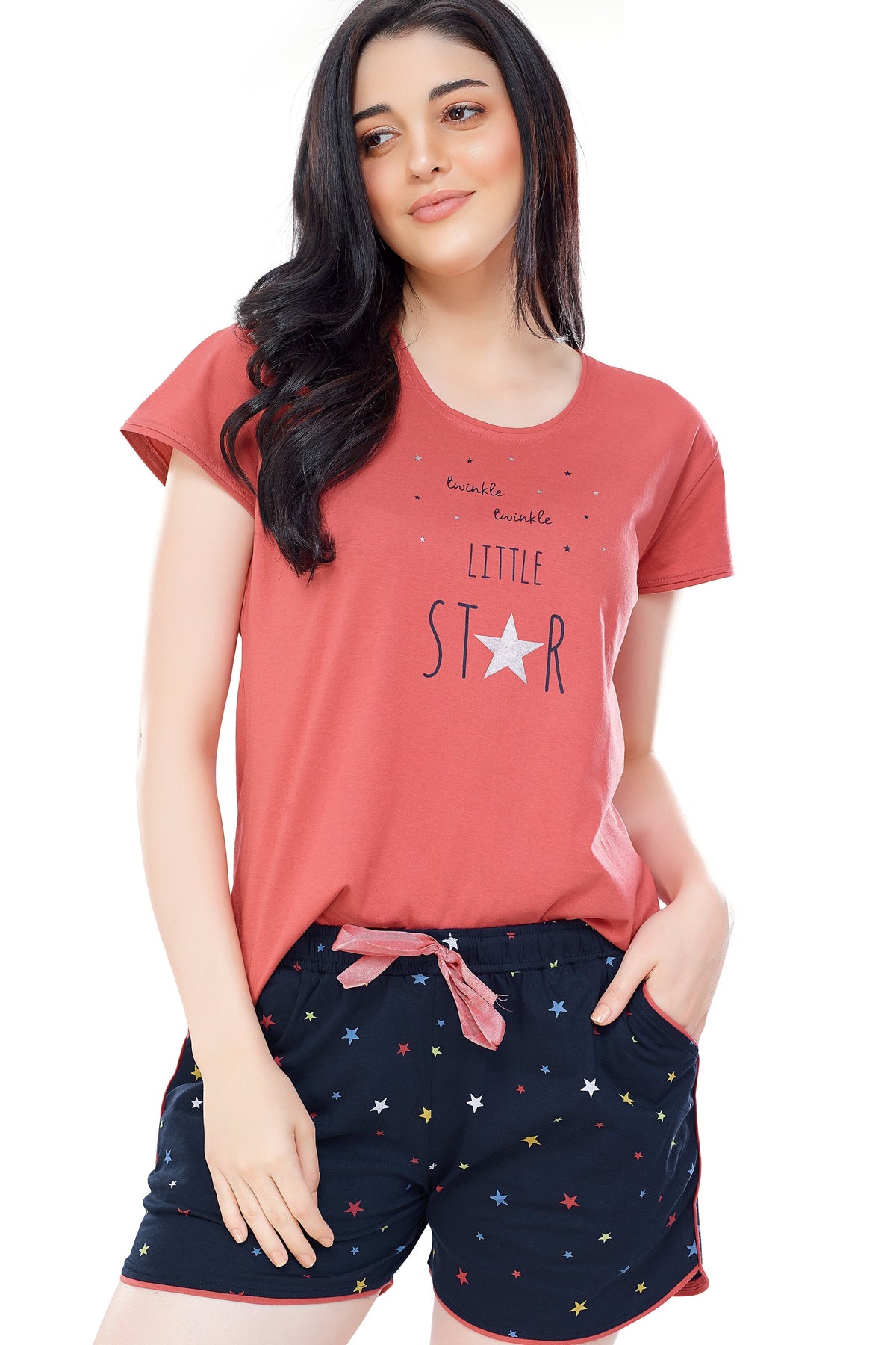 - Rust brown and navy blue star printed night suit consists of top and shorts