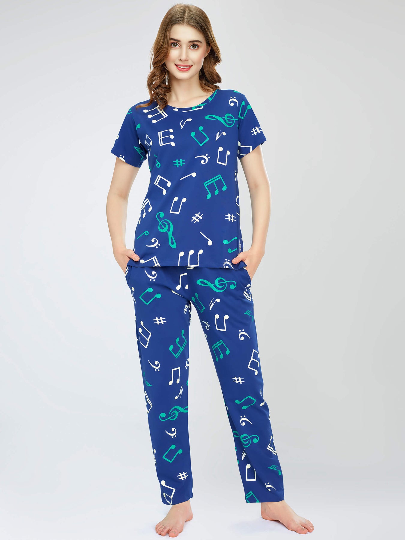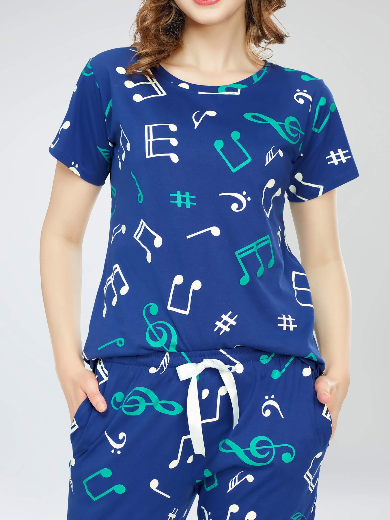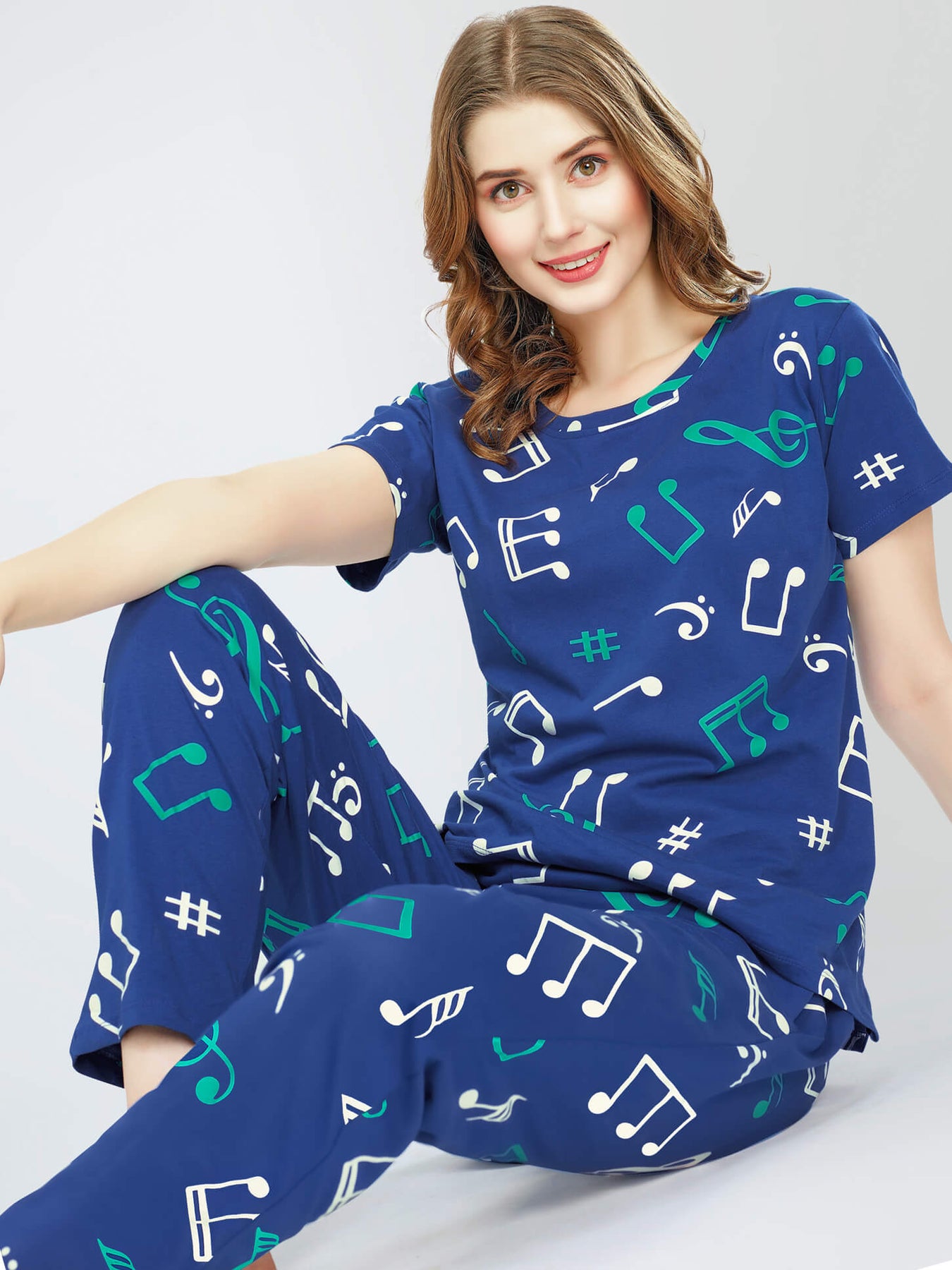 - Blue Musical Notes Printed Cotton Night Dress of top and pyjamas