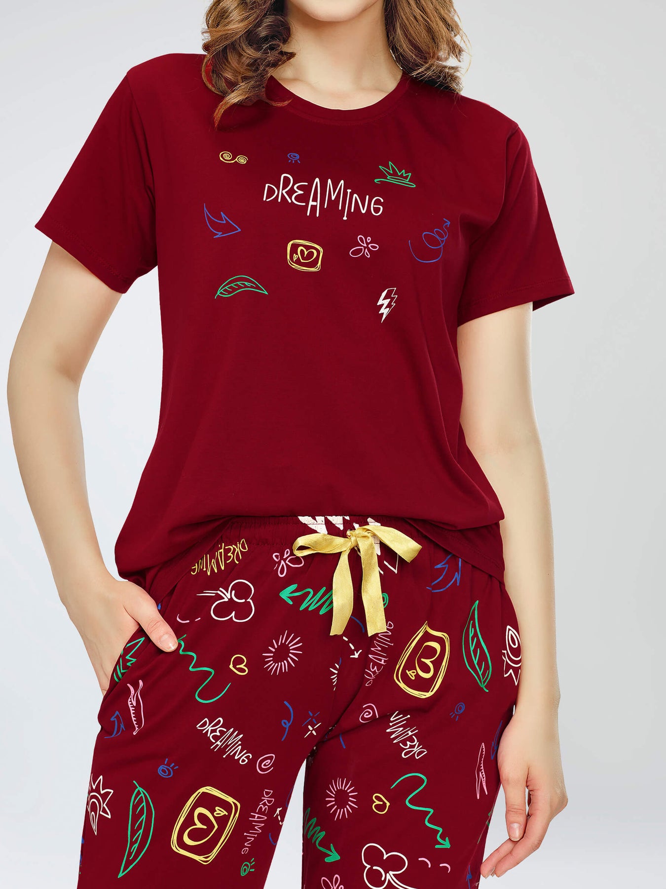 - A pair of Maroon printed pyjamas, has drawstring closure