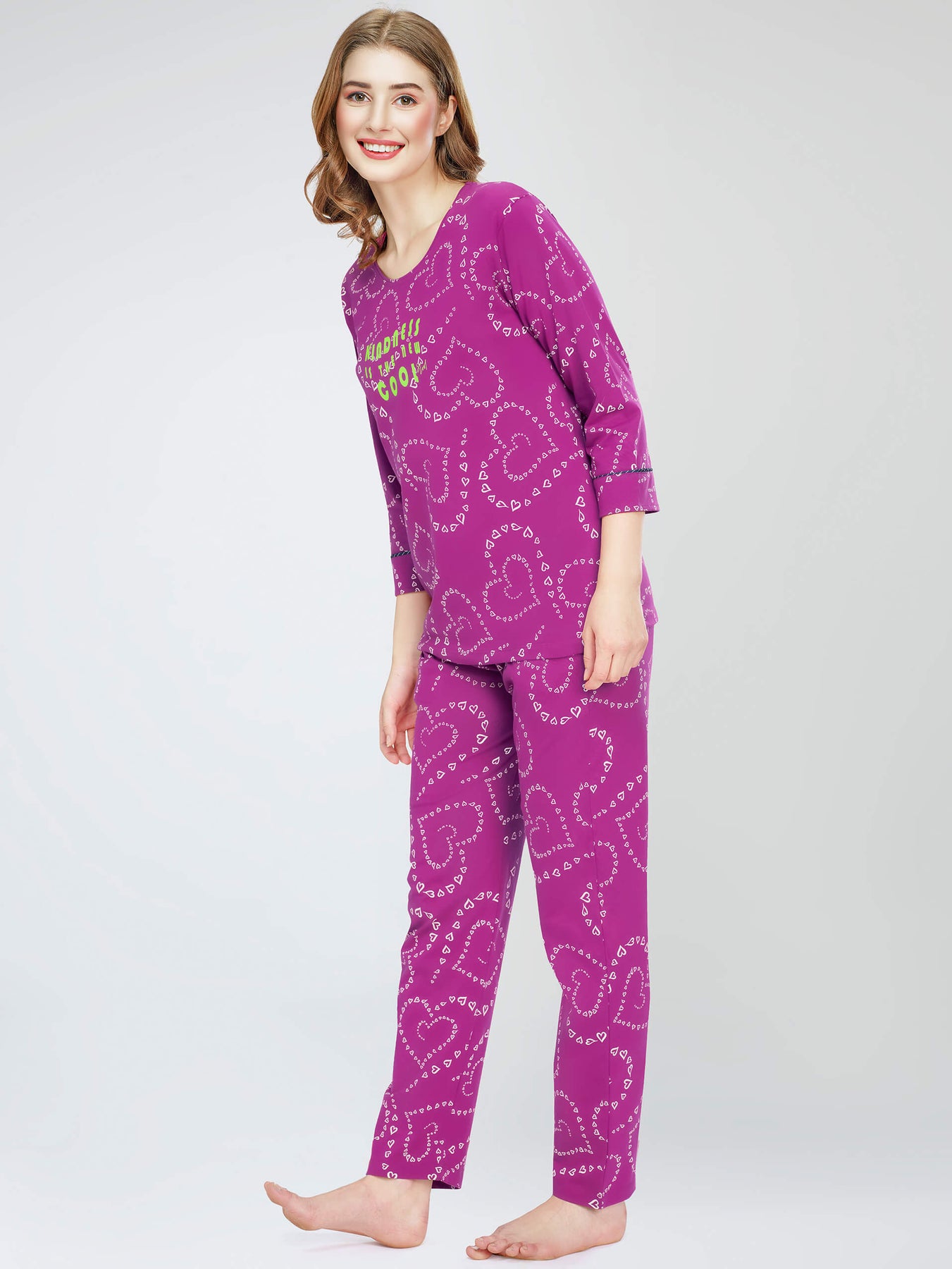 • Purple Heart Printed Cotton Night Dress of top and pyjamas