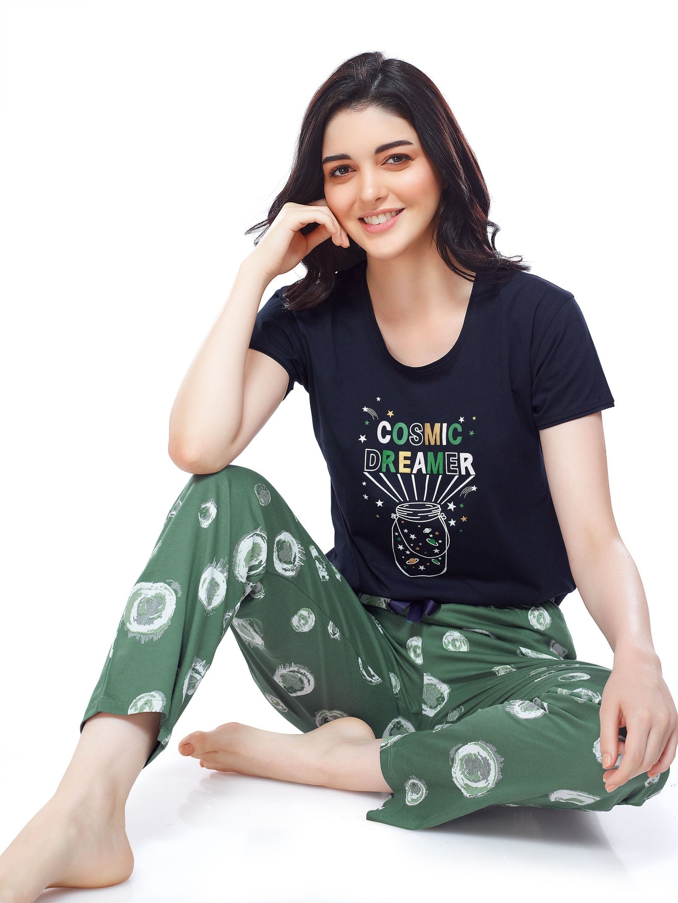 - A green bubble printed pyjamas, has drawstring closure