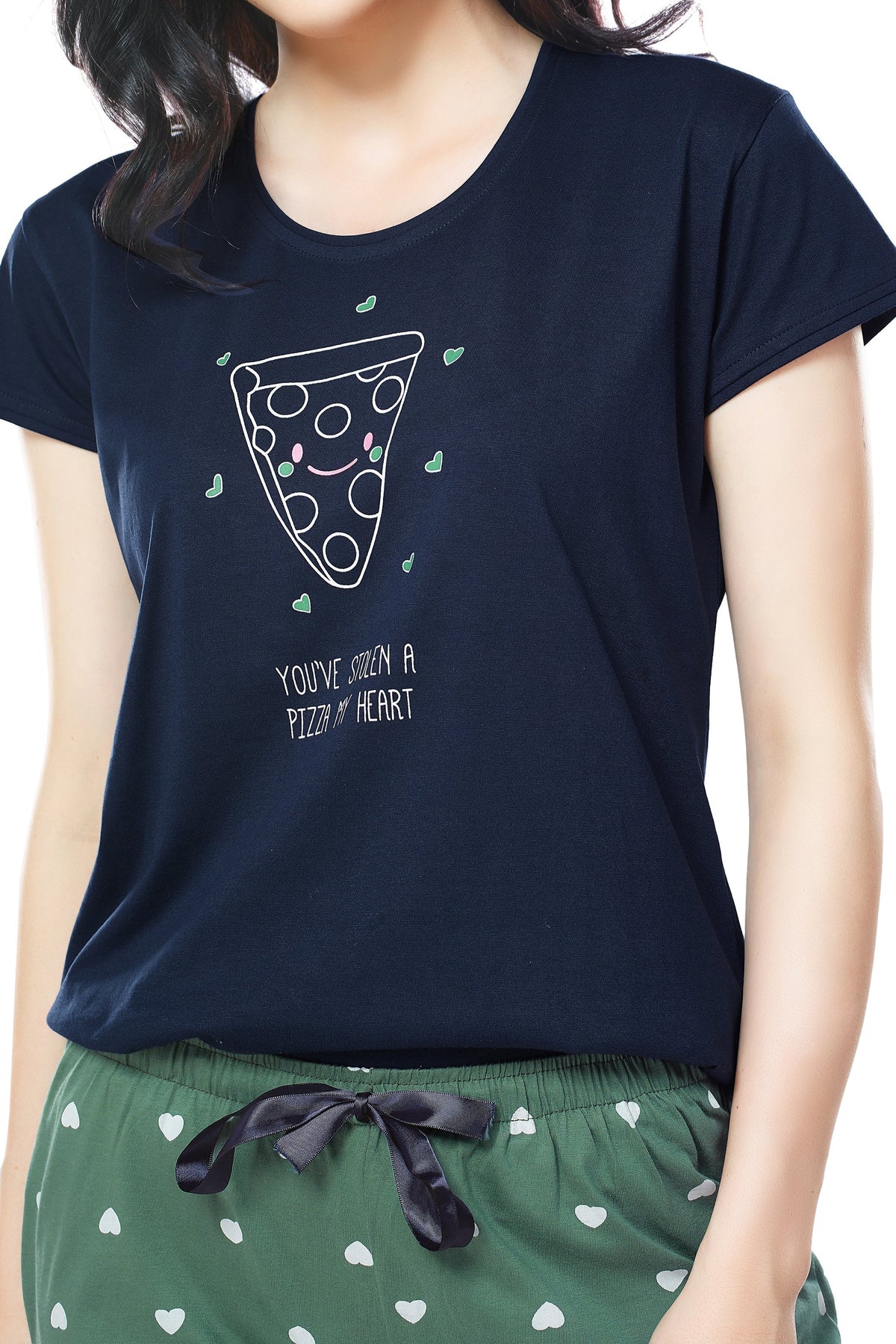 Women's Cotton Navy Blue Heart Printed Stylish Night Suit Set