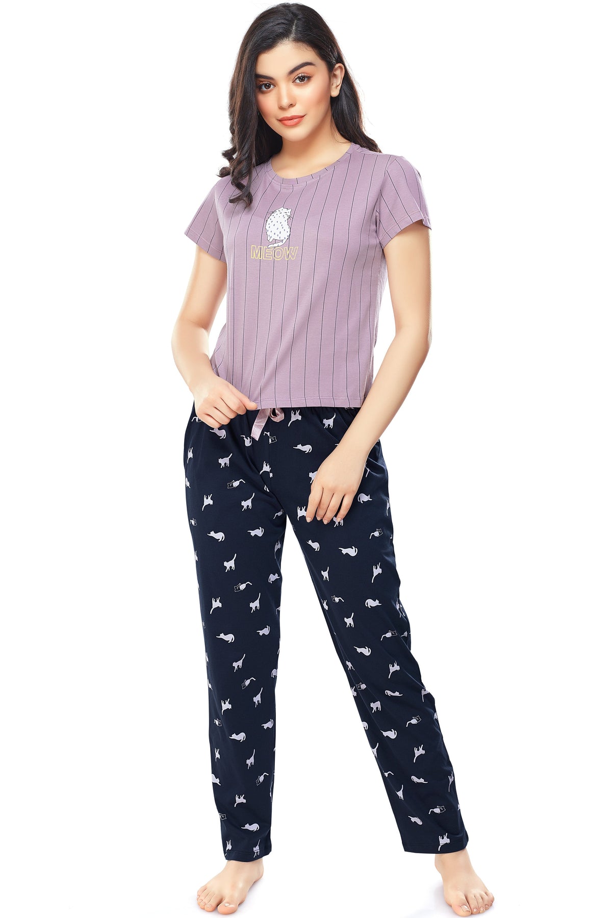 - A navy blue cat printed pyjamas, has drawstring closure
