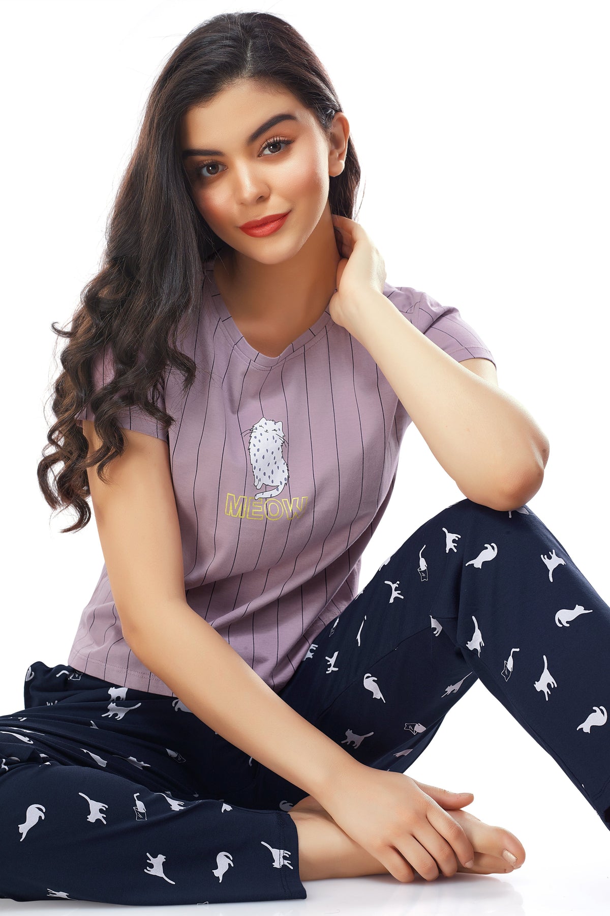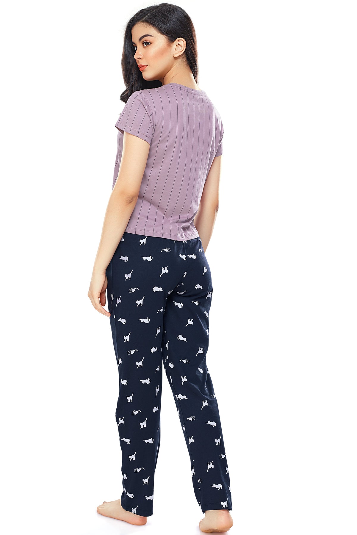 - Purple and navy blue night suit consists of crop top and pyjamas